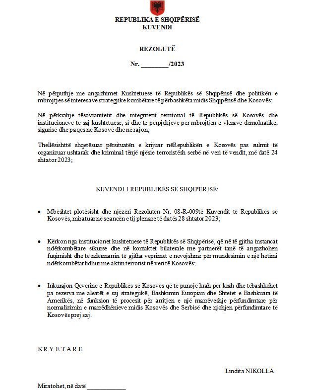 Palët kanë arritur kështu dakordësinë që nesër Kuvendi të miratojë një Rezolutë që parashikon mbështetjen plotësisht të Rezolutës Nr. 08-R-009 të Kuvendit të Republikës së Kosovës, miratuar në seancën e tij plenare të datës 28 shtator 2023; hetimin ndërkombëtar dhe nxitjen për të vijuar dialogun me qëllim final njohjen e pavarësisë së Kosovës nga ana e Serbisë. Në këtë mënyrë, Shqipëria unifikon plotësisht qëndrimin me Kosovën, duke mbajtur përgjegjëse Serbinë për sulmin e 24 Shtatorit dhe duke bërë gjithçka që të ketë një hetim ndërkombëtar ndaj Serbisë.