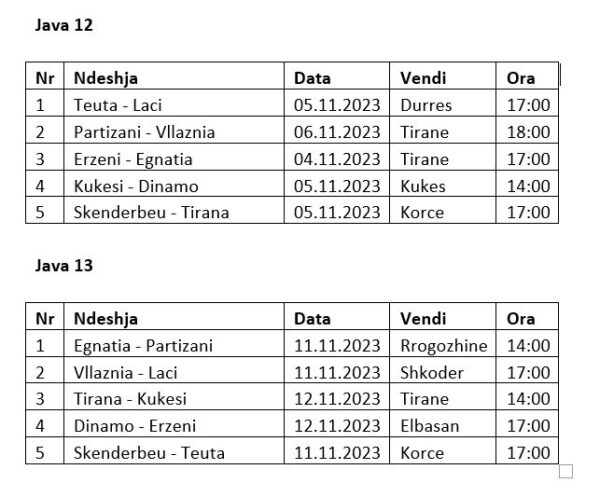 Ndërkaq, ndeshjet e javës së dhjetë do të luhen të ndara në dy ditë në datat 27 dhe 28 tetor, duke nisur me sfidën Kukësi – Vllaznia dhe duke ulur siparin me dy ndeshjet Teuta – Partizani dhe Skënderbeu – Egnatia, që do të zhvillohen në të njëjtën orar 17:00.