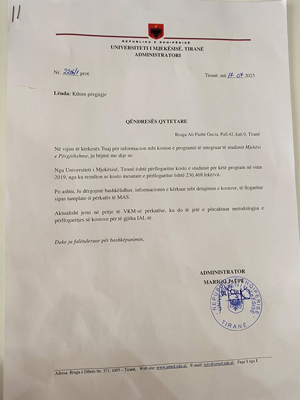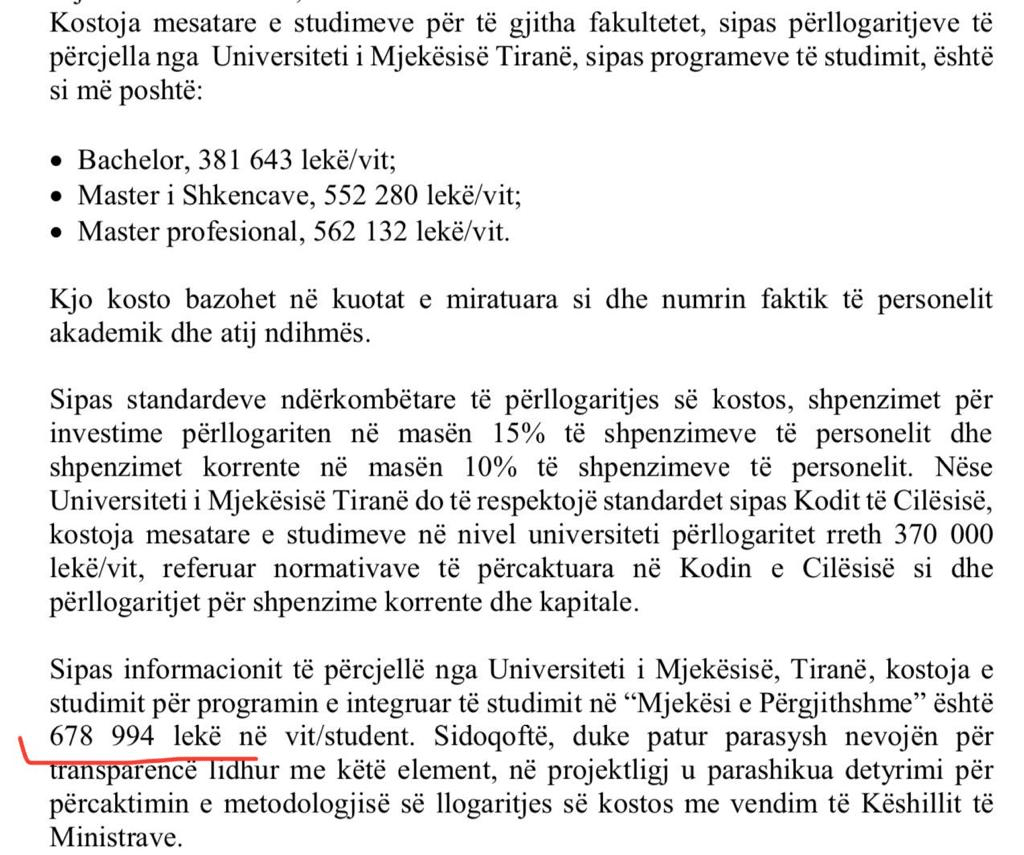 Kjo vlerë është dërguar me shkresë zyrtare nga Universiteti i Mjekësisë si përgjigje ndaj Qëndresës Qytetare (shkresa numër protokolli 2206/1, datë 17.07.2023), pra katër ditë përpara miratimit të ligjit famëkeq që merr peng diplomat e studentëve të Mjekësisë. (Bashkangjitur shkresa). Ndërkohë, në relacionin e përgatitur në Parlamentin e Shqipërisë citohet se “Sipas informacionit të përcjellë nga Universiteti i Mjekësisë, Tiranë, kostoja e studimit për programin e integruar të studimit në “Mjekësi e Përgjithshme” është 678.994 lekë/vit”.