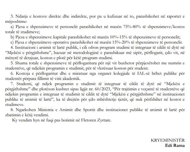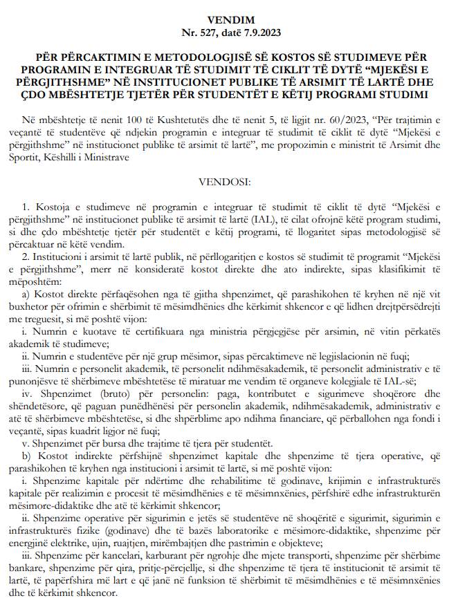 Vendimi Nr. 527, dt 7.9.2023 në pikën 6 përcakton që kosto duhej përllogaritur para fillimit të vitit akademik.