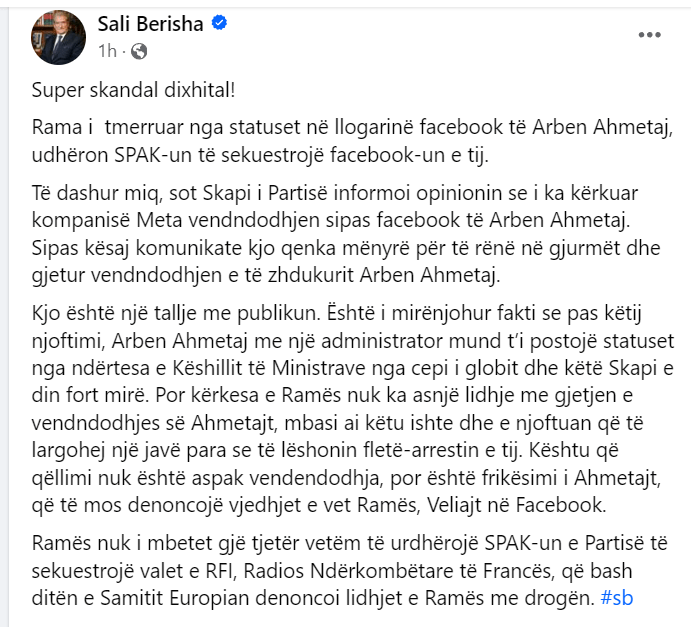 “Super skandal dixhital! Rama i tmerruar nga statuset në llogarinë facebook të Arben Ahmetaj, udhëron SPAK-un të sekuestrojë facebook-un e tij. Të dashur miq, sot Skapi i Partisë informoi opinionin se i ka kërkuar kompanisë Meta vendndodhjen sipas facebook të Arben Ahmetaj. Sipas kësaj komunikate kjo qenka mënyrë për të rënë në gjurmët dhe gjetur vendndodhjen e të zhdukurit Arben Ahmetaj. Kjo është një tallje me publikun. Është i mirënjohur fakti se pas këtij njoftimi, Arben Ahmetaj me një administrator mund t’i postojë statuset nga ndërtesa e Këshillit të Ministrave nga cepi i globit dhe këtë Skapi e din fort mirë. Por kërkesa e Ramës nuk ka asnjë lidhje me gjetjen e vendndodhjes së Ahmetajt, mbasi ai këtu ishte dhe e njoftuan që të largohej një javë para se të lëshonin fletë-arrestin e tij. Kështu që qëllimi nuk është aspak vendendodhja, por është frikësimi i Ahmetajt, që të mos denoncojë vjedhjet e vet Ramës, Veliajt në Facebook. Ramës nuk i mbetet gjë tjetër vetëm të urdhërojë SPAK-un e Partisë të sekuestrojë valet e RFI, Radios Ndërkombëtare të Francës, që bash ditën e Samitit Europian denoncoi lidhjet e Ramës me drogën.” – shkruan Berisha.
