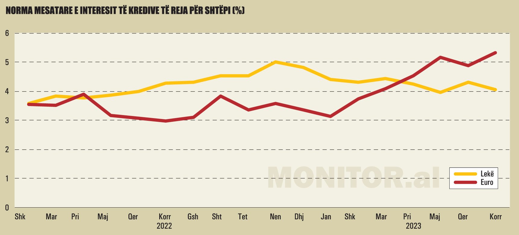 Për kreditë në euro norma mesatare në muajin korrik 2023 arriti 5,32% nga 3,54% që ishte për muajin shkurt 2022.