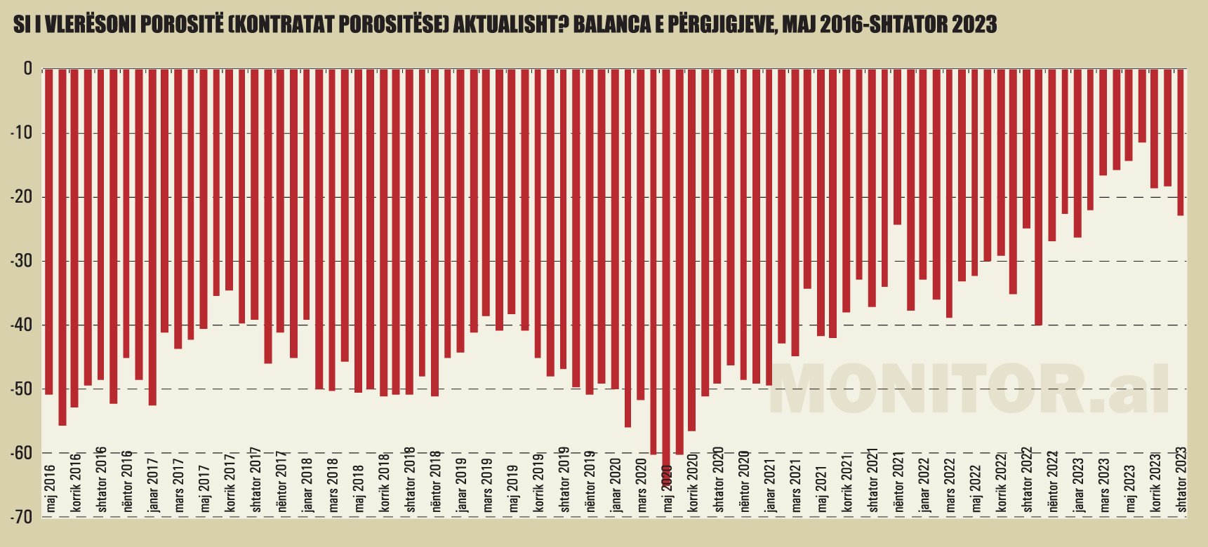 Edhe pritshmëritë e ndërtuesve për kontratat e shitjeve janë në kahun rënës. Sipas vrojtimit të Bankës së Shqipërisë për besimin e biznesit dhe konsumatorit, në muajin shator treguesi që paraqet balancën e kontratave porositëse në ndërtim shënoi një vlerë negative prej 22.9 pikë , duke u thelluar edhe më shumë nga niveli -18.3 pikë i muajit gusht 2023.