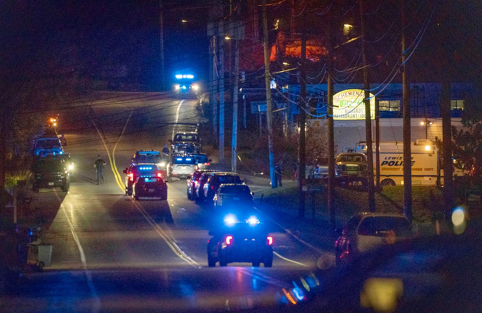 Zyrtarët thanë se kishte shumë viktima, por nuk pranuan të japin shifra. Policia e shtetit dhe ajo lokale identifikuan Robert R. Card, 40 vjeç, si të dyshuar për rastin, pasi kishte postuar më parë në Facebook fotografi të një burri që mbante atë që dukej të ishte një pushkë gjysmë automatike. Fotografitë nga një nga skenat e krimit të së mërkurës tregonin një burrë me mjekër me kapuç kafe dhe xhinse, duke mbajtur armën në pozicionin e qitjes.