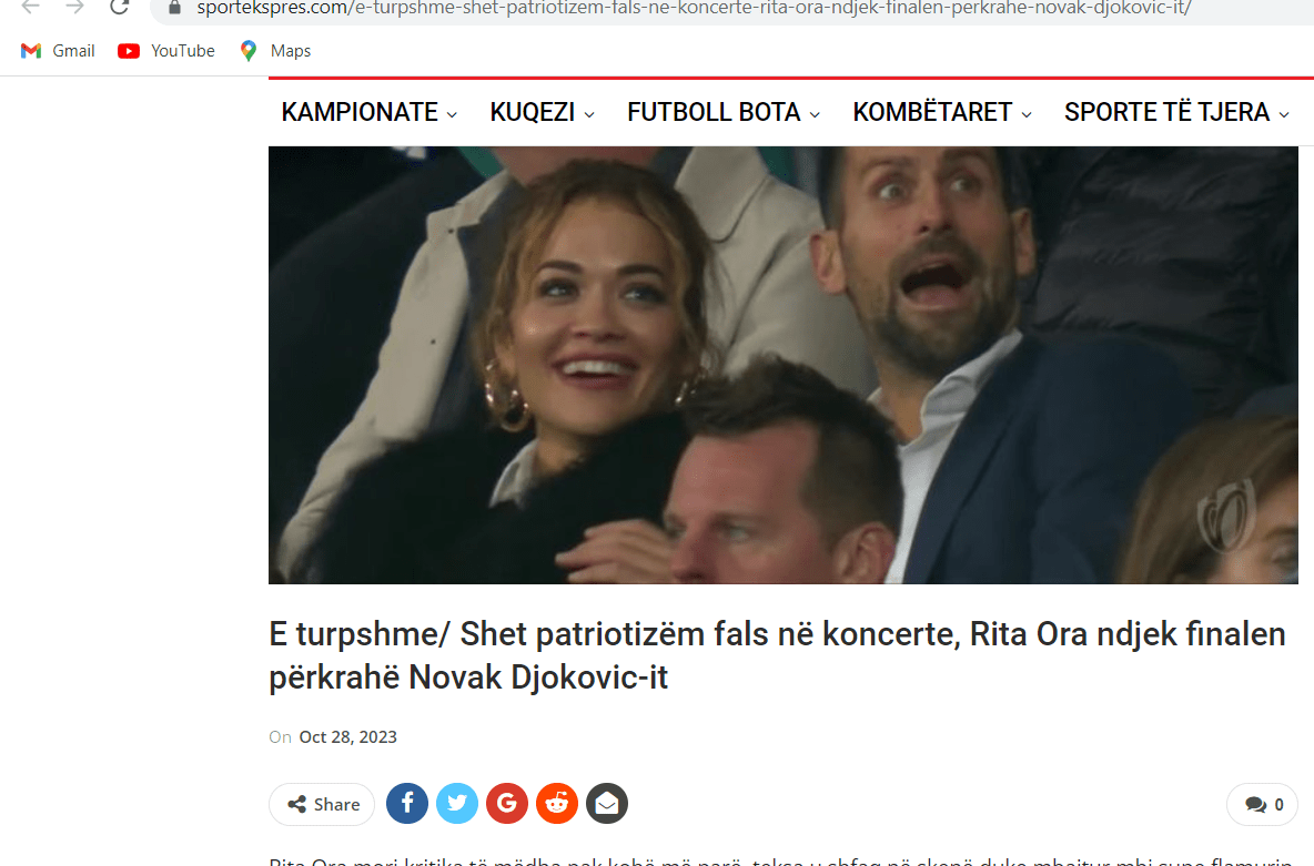 Këngëtarja me prejardhje nga Kosova, Rita Ora, është parë duke ndjekur finalen e Kupës së Botës në “Rugby”, krahë tenistit serb Novak Gjokoviç i cili njihet për deklaratat e tij me nota urrejtjeje kundër shqiptarëve dhe Kosovës, duke thënë se Kosova është Serbi.