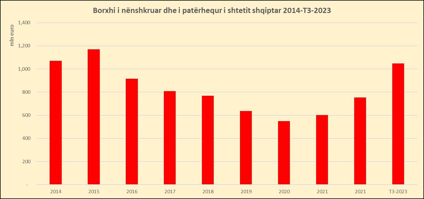 Borxhi i huaj i nënshkruar i patërhequr arriti mbi 1 miliard euro në 9-mujorin 2023 duke u rritur me 39% nga fundi i vitit 2022 dhe nivelin më të lartë që nga viti 2015.
