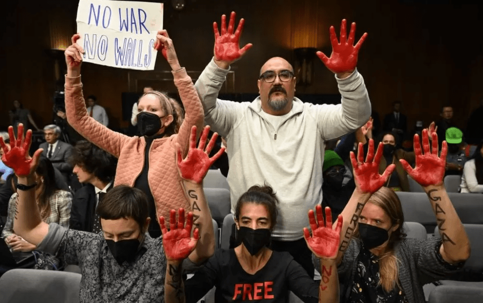 Protestuesit që bënin thirrje për një armëpushim në Gaza ndërprenë Sekretarin Amerikan të Shtetit Antony Blinken gjatë një seance dëgjimore në Senat të martën.