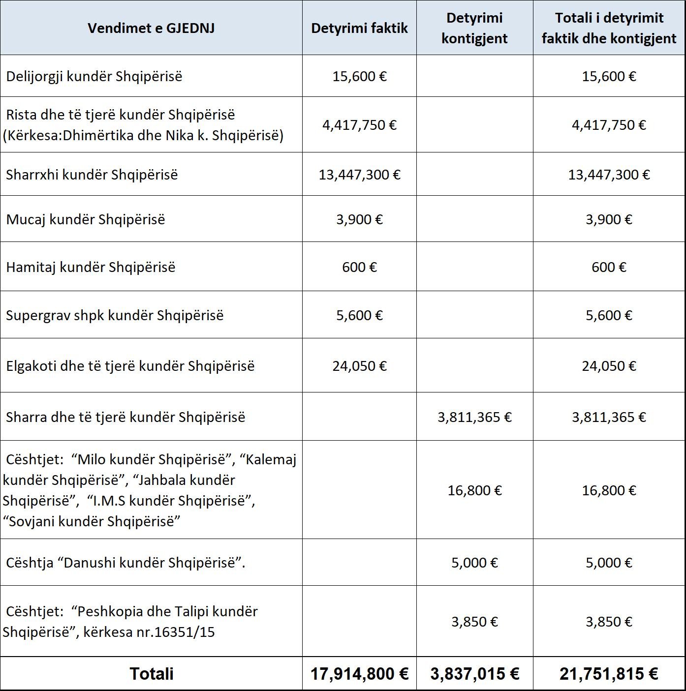Ndërsa totali i detyrimeve nga vendimet e GJEDNJ-së deri në shtator 2023 arrin rreth 21,7 mln euro (nga ku detyrimi faktik vlerësohet 17,9 milionë euro dhe detyrimi kontingjent 3,8 milionë euro).