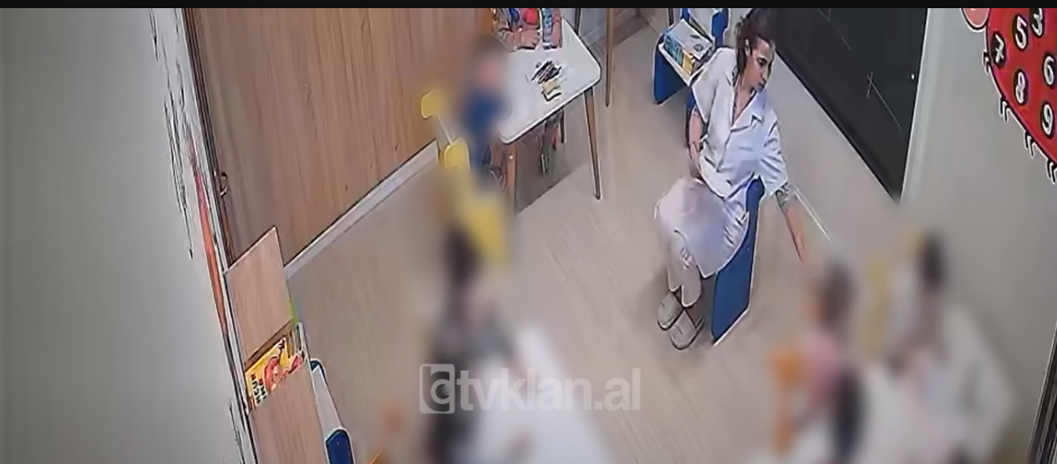 Në pamjet e kamerave të sigurisë, shfaqet edukatorja Majlinda Dhima që në disa raste godet 3-vjeçaren me vizore e shuplaka.