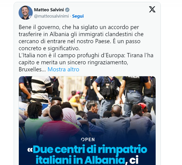 “Qeveria po ecën mirë, pasi ka nënshkruar një marrëveshje për transferimin e emigrantëve të paligjshëm që tentojnë të hyjnë në vendin tonë në Shqipëri. Është një hap konkret dhe domethënës. Italia nuk është kampi i refugjatëve i Evropës: Tirana e ka kuptuar këtë dhe meriton falenderime të sinqerta, Brukseli ende jo.” – shkruan Salvini në X.