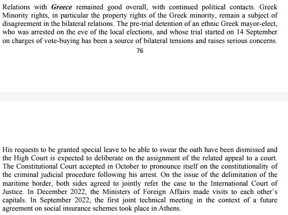“Marrëdhëniet me Greqinë mbetën të mira në përgjithësi, me kontakte të vazhdueshme politike. Të drejtat e pakicave greke, në veçanti të drejtat pronësore të pakicës greke, mbeten një subjekt mosmarrëveshjesh në marrëdhëniet dypalëshe. Ndalimi para gjyqit i një kryebashkiaku të zgjedhur etnik grek, i cili u arrestua në prag të zgjedhjeve lokale dhe gjyqi i të cilit filloi më 14 shtator me akuzën e blerjes së votave ka qenë një burim tensionesh dypalëshe dhe ngre shqetësime serioze.