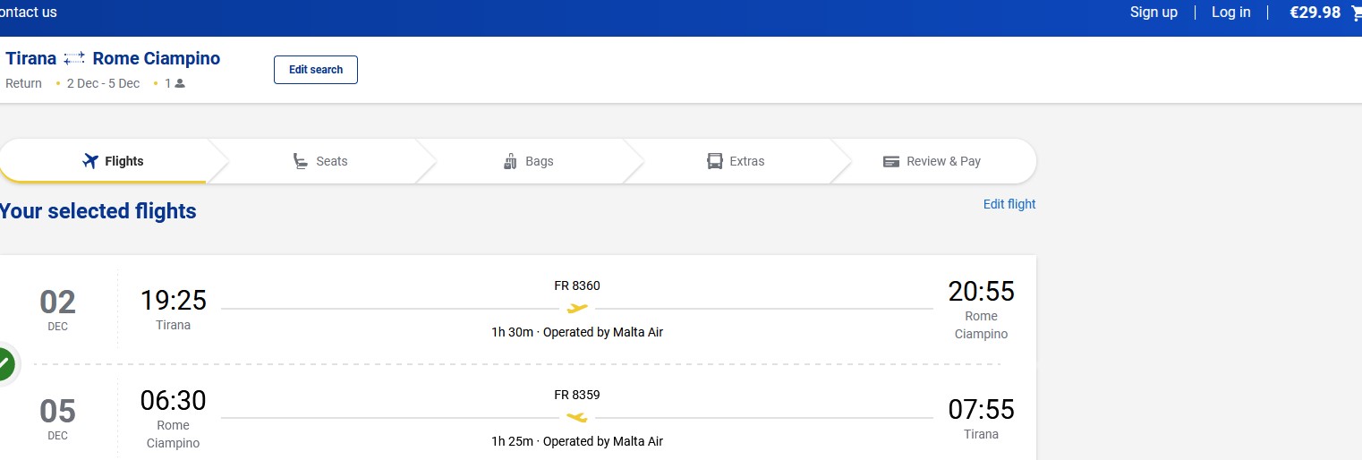 Për në Romë, në të njëjtat data vajtja për në Romë me Wizz Air kushton 10 euro dhe kthimi 18 euro, për një total prej 28 eurosh (kjo është alternativa më e lirë). Me Ryanair për të njëjtat data, bileta kushton 30 euro.