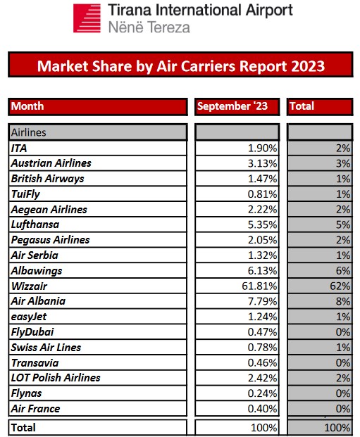 Operatori me kosto të ulët Wizz Air kishte 62% të tregut sipas numrit të pasagjerëve në shtator 2023, sipas të dhënave nga Tirana International Airport. Wizz ka marrë vazhdimisht treg nga operatorët e tjera si Air Albania dhe Alba Wings, që kishin përkatësisht 7.8% dhe 6.1% të tregut në fund të shtatorit.