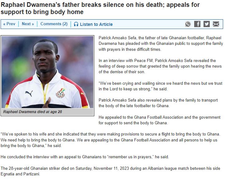 Patrick Amoako Sefa, babai i futbollistit i cili u nda nga jeta të shtunën, 11 nëntor 2023, Raphael Dwamena, po u bën thirrje urgjente autoriteteve të futbollit për ndihmë në kthimin e trupit të djalit të tij në Ganë.