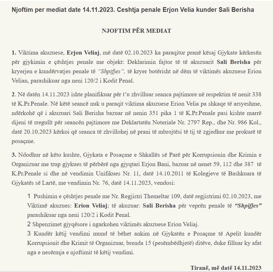 - Në datën 14.11.2023 ishte planifikuar për t’u zhvilluar seanca pajtimore në respektim të nenit 338 të K.Pr.Penale. Në këtë seancë nuk u paraqit viktima akuzuese Erion Velia pa shkaqe të arsyeshme, ndërkohë që i akuzuari Sali Berisha bazuar në nenin 351 pika 1 të K.Pr.Penale pasi kishte marrë dijeni të rregullt për seancën pajtimore me Deklartatën Noteriale Nr. 2797 Rep., dhe Nr. 986 Kol., datë 20.10.2023 kërkoi që seanca të zhvillohej në prani të mbrojtësi të tij të zgjedhur me prokurë të posaҫme.