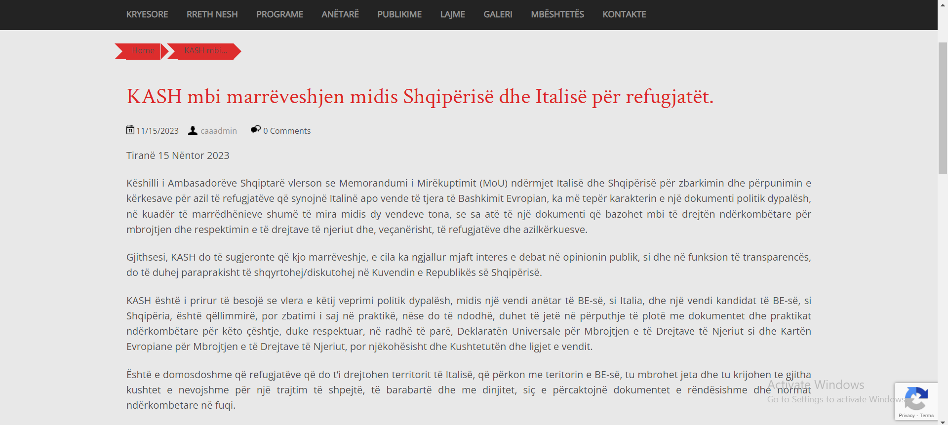 Gjithsesi, KASH do të sugjeronte që kjo marrëveshje, e cila ka ngjallur mjaft interes e debat në opinionin publik, si dhe në funksion të transparencës, do të duhej paraprakisht të shqyrtohej/diskutohej në Kuvendin e Republikës së Shqipërisë. KASH është i prirur të besojë se vlera e këtij veprimi politik dypalësh, midis një vendi anëtar të BE-së, si Italia, dhe një vendi kandidat të BE-së, si Shqipëria, është qëllimmirë, por zbatimi i saj në praktikë, nëse do të ndodhë, duhet të jetë në përputhje të plotë me dokumentet dhe praktikat ndërkombëtare për këto çështje, duke respektuar, në radhë të parë, Deklaratën Universale për Mbrojtjen e të Drejtave të Njeriut si dhe Kartën Evropiane për Mbrojtjen e të Drejtave të Njeriut, por njëkohësisht dhe Kushtetutën dhe ligjet e vendit.