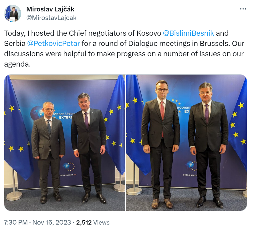 I dërguari i Posaçëm i Bashkimit Evropian për dialogun Kosovë – Serbi, Miroslav Lajçak, është shprehur në platformën X, të enjten për takimet që ka pasur ndaras me kryenegociatorin e Kosovës për dialogun, Besnik Bislimi dhe kryenegociatorin serb, Petar Petkoviq.