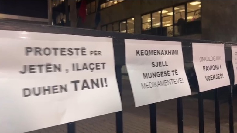 Qytetarët kanë protestuar mbrëmjen e sotme para ministrisë së Shëndetësisë për mungesën e ilaçeve jetëshpëtuese. Në derën e institucionit janë vendosur fletushka me shkrime të ndryshme nga qytetarët të cilët ankohen për mungesën e ilaçeve jetëshpëtuese në pavionin e onkologjikut.