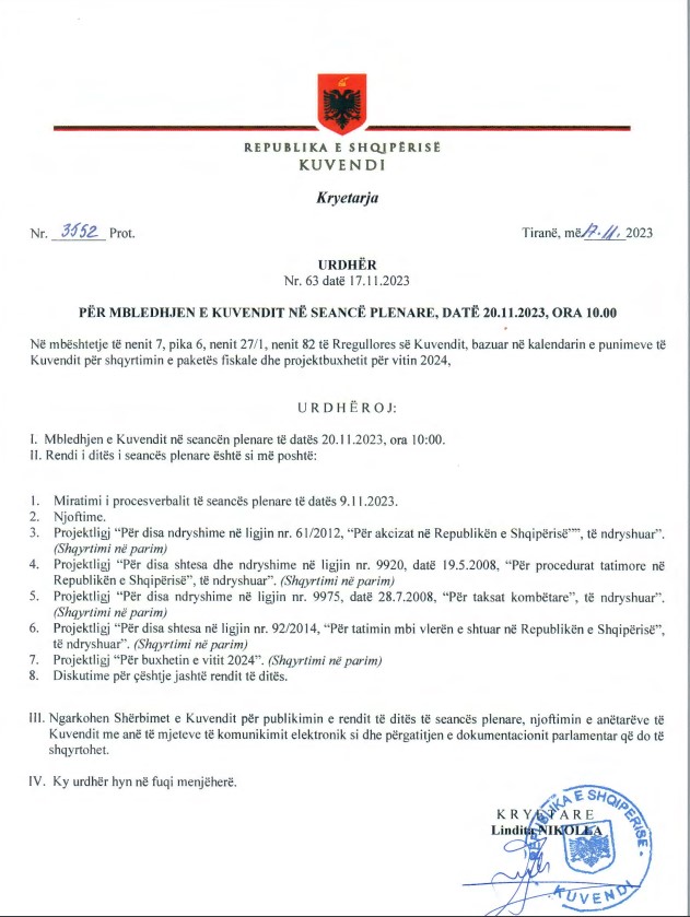 Ditën e sotme në orën 10:00 është caktuar seancë Parlamentare ku do diskutohet projekt-buxheti për vitin 2024.
