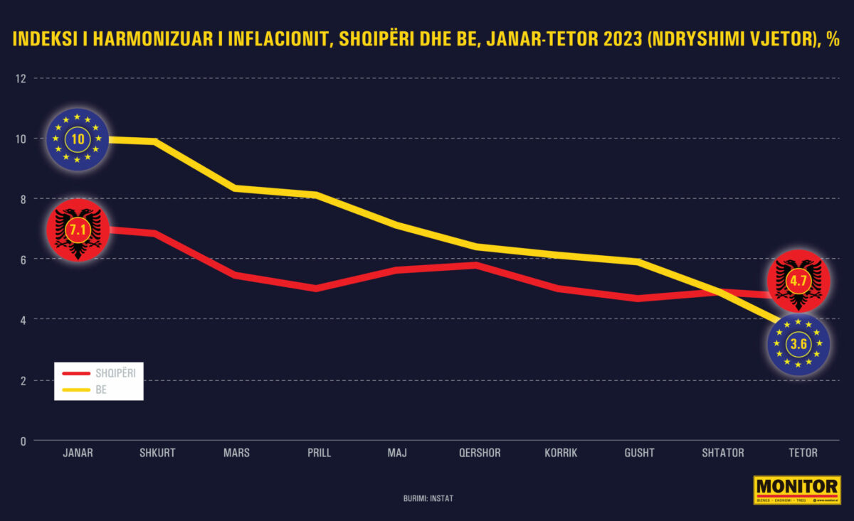 Në janar të vitit 2023 IHCK në BE ishte gati 3 pikë përqindje më i lartë se në Shqipëri (shiko grafikun bashkëngjitur), përkatësisht 10 dhe 7.1%.