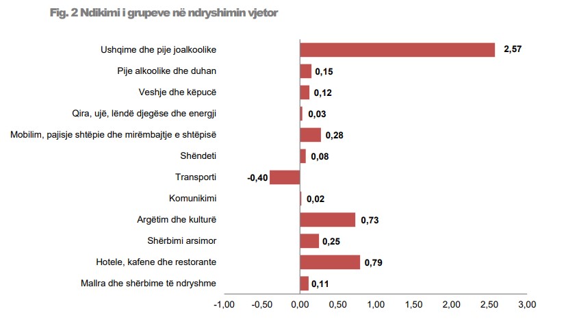 Nga ana tjetër, çmimet e grupit “Argëtim dhe kulturë” u ulën me 0,5%, pasuar nga “Ushqime dhe pije joalkoolike” me 0,2%, “Pije alkoolike dhe duhan” dhe “Mobilim, pajisje shtëpie dhe mirëmbajtje” me 0,1% secili.