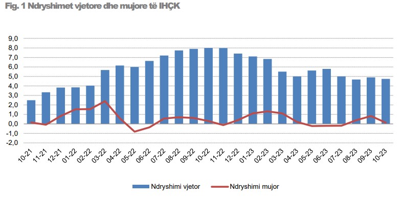 Në muajin Tetor, ndryshimi mujor i matur nga indeksi i Harmonizuar i Çmimeve të Konsumit është 0,1%. Ky ndryshim është ndikuar kryesisht nga rritja e çmimeve të grupit “Hotele, kafene dhe restorante” me 1,4%, pasuar nga grupet “Veshje dhe këpucë” me 0,6%, “Qira, ujë, lëndë djegëse dhe energji” me 0,3%, “Transporti” me 0,2% dhe “Shërbimi arsimor” me 0,1%.