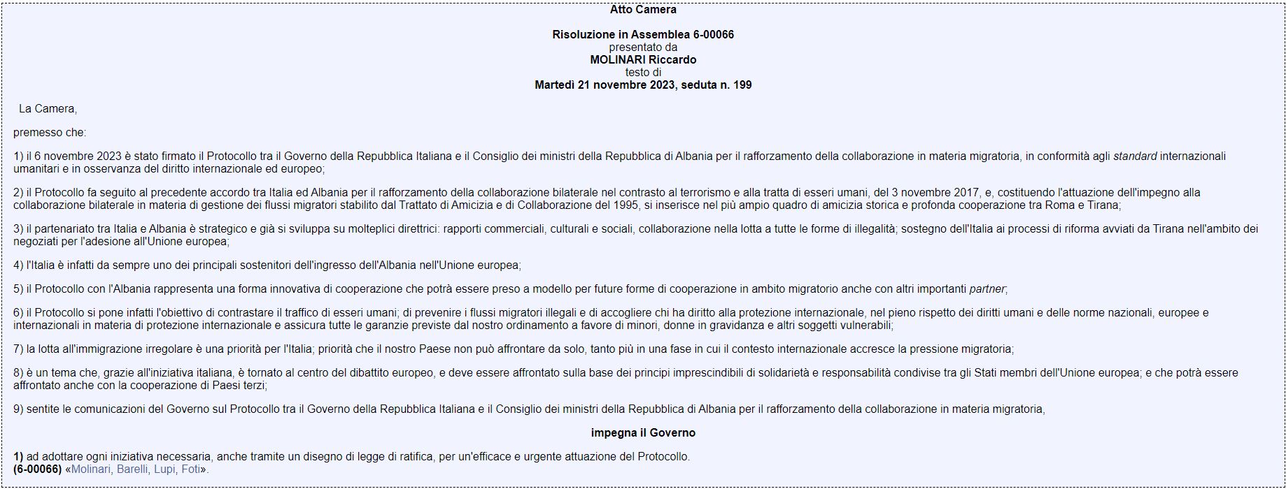 “Protokolli me Shqipërinë përfaqëson një formë inovative bashkëpunimi që mund të merret si model për format e ardhshme të bashkëpunimit në fushën e migracionit edhe me partnerë të tjerë të rëndësishëm”– thuhet në rezolutë.