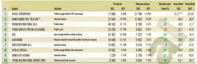 Kufiri i kompanisë së 10 për nga fitimet në vlerë absolute në 2021 ishte 2.2 miliardë lekë, ndërsa në vitin 2022 u rrit në 3.6 miliardë lekë. Pragu i hyrjes në renditjen e 200 në vitin 2022 ishte rreth 170 milionë lekë, nga 156 milionë lekë vitin e mëparshëm.