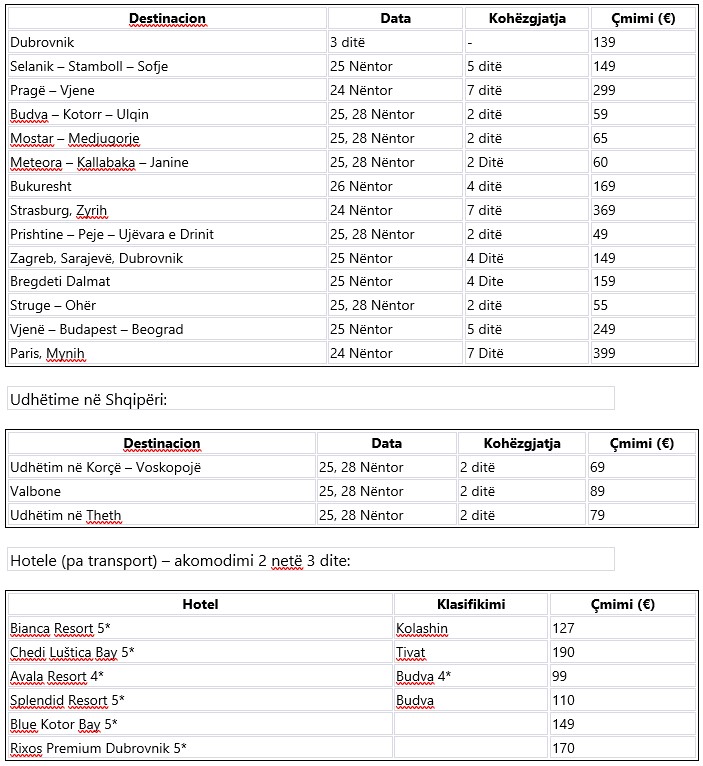 Sa i përket udhëtimeve jashtë, në komunikim me disa nga agjencitë në vend, kryeson Italia, ku qytete ti Verona, Milano, Napoli, Roma kanë qenë të preferuara. Ofertat turistike kanë nisur me 99 euro për person, për 2 net dhe 3 ditë , akomodim me mëngjes.