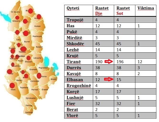Gjatë orëve të natës ka pasur reshje shiu me intensitet, të cilat kanë shkaktuar rënie gurësh e inertesh në disa akse si: Skuraj-Burrel, Elbasan-Qafë-Thanë, Vaudejes-Pukë-Kukës, Bulqize-Urë e Cerenecit, Berat-Çorovodë, rrëshkitje dheu në Klos-Qafë Buall.