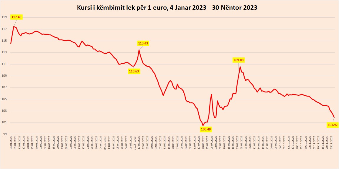Kursi Euro-Lek po shënon një cikël të ri dhe të papritur rënieje, që po e çon pranë niveleve më të ulëta historike, që u regjistruan në korrik të këtij viti. Forcimi i Lekut në teori ndihmon në uljen e presioneve inflacioniste, por nga ana tjetër vendos në sprovë të mëtejshme ata sektorë të ekonomisë me të ardhura në valutë dhe shpenzime në Lekë, duke filluar nga eksportuesit e mallrave dhe të shërbimeve.