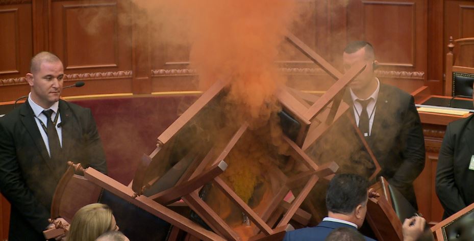Pas futjes së pjesës tjetër të deputetëve demoratë, në sallë u hodh një tymuese ndërkohë që karriget e tyre ishin hedhur më herët në mes të sallës, siç ka ndodhur në seancat e fundit.