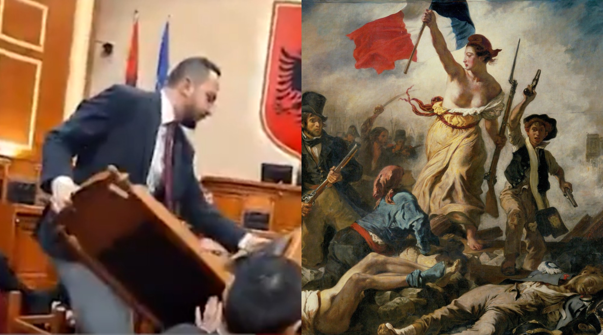 Në një çast, deputeti demokrat Salianji hipi sipër grumbullimit të karrigeve, një pamje që të sjell në mendje pikturën e e famshme “La Liberté guidant le people” (Liria duke udhëhequr popullin) të piktorit francez Eugène Delacroix, që personifikon Revolucionin e Korrikut 1830 në Paris, që rrëoi Mbretin Charles X.