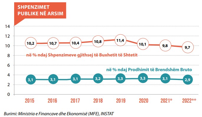 Të dhënat zyrtare të INSTAT tregojnë se, në vitin 2022 shpenzimet publike në sektorin e arsimit ishin 62.9 miliardë lekë ose 2,9% e PBB-së. Krahasuar me vitin 2021, shpenzimet publike në arsim shprehur si përqindje ndaj PBB-së kanë shënuar ulje me 0,2 pikë përqindje, ndërkohë shprehur si përqindje ndaj shpenzimeve publike gjithsej, kanë shënuar rënie me 0,1 pikë përqindje.
