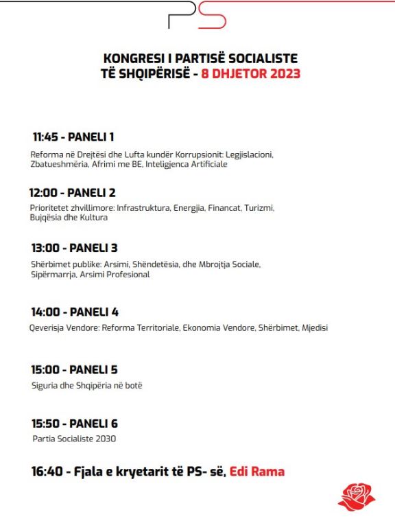 Sipas agjendës të bërë publike, punimet e kongresit nisin në orën 11:45 dhe do të jenë të ndarë në 6 panele: Reforma në Drejtësi dhe Lufta kundër Korrupsionit, Prioritetet zhvillimore, Qeverisja Vendore, Siguria dhe Shqipëria në botë si dhe Partia Socialiste 2030.