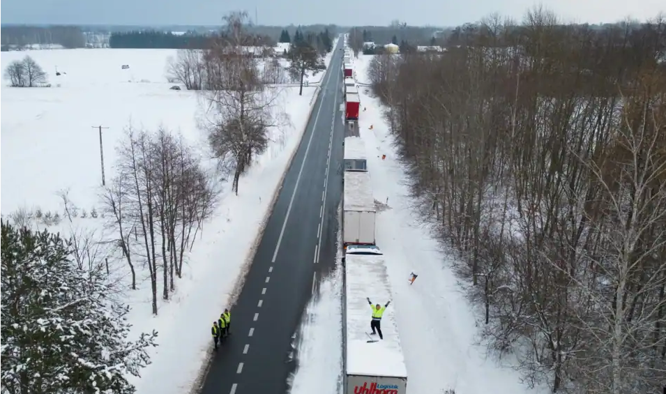 Që nga 6 nëntori drejtuesit e kamionëve në Poloni kanë bllokuar rrugët hyrëse drejt pikave kufitare. Radha e makinave shkon rreth 30 kilometra e gjatë, automjeteve i duhen të presin rreth tre javë në temperaturat e acarta.