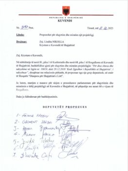 Deputetët propozues janë, Fatmir Mediu, Gazment Bardhi, Agron Gjekmarkaj, Agron Duka, Jorida Tabaku, Emilia Koliqi, Dhurata Çupi Tyli.
