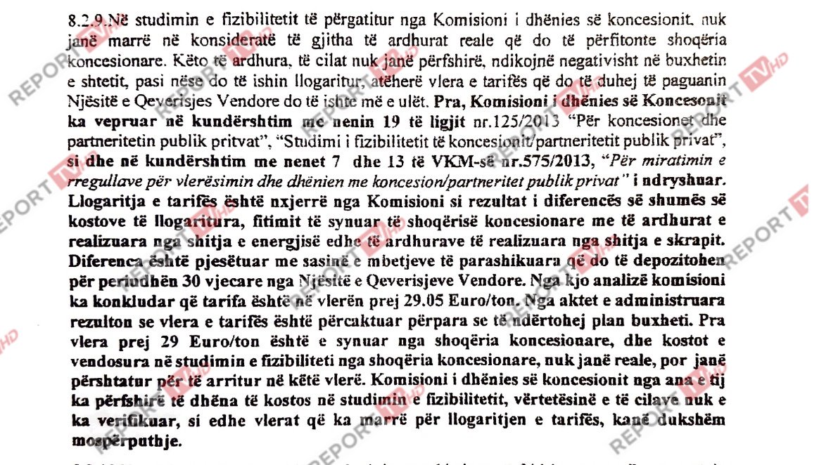 Pra vlera prej 29 Euro/ton është e synuar nga shoqëria koncesionare, dhe kostot e vendosura në studimin e fizibiliteti nga shoqëria koncesionare, nuk janë reale, por janë përshtatur për të arritur në këtë vlerë. Komisioni i dhënies së koncesionit nga ana e tij ka përfshirë të dhëna të kostos në studimin e fizibilitetit, vërtetësinë e të cilave nuk e ka verifikuar, si edhe vlerat që ka marrë për llogaritjen e tarifës, kanë dukshëm mospërputhje’ shkruhet në faqen 90 të dosjes.