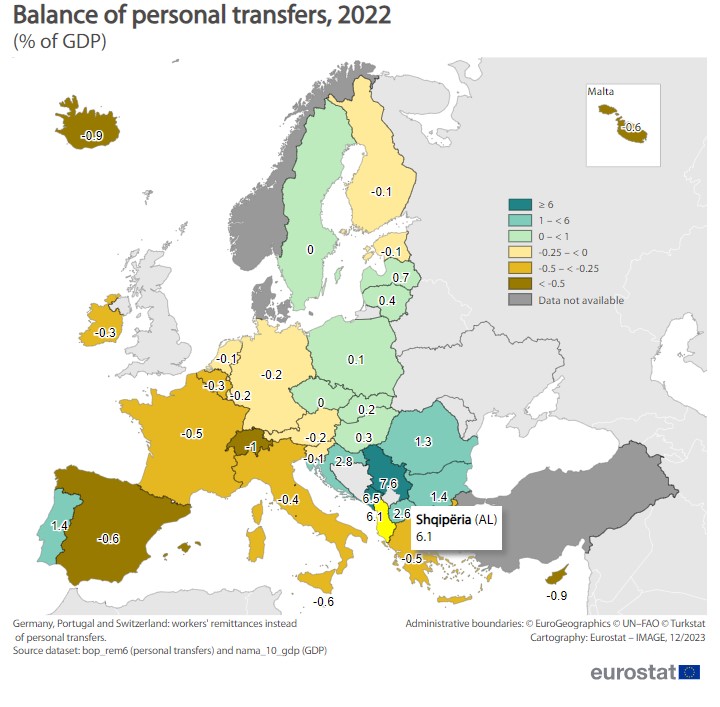 Të dhënat krahasuese të Eurostat tregojnë se vendi me varësinë më të madhe nga remitancat në Rajon ngelet Kosova. Për vitin 2022, remitancat përbënin 17.2% të Prodhimit të Brendshëm Bruto të vendit. Vijon Mali i Zi, me 13.3%, i ndjekur nga Bosnjë-Hercegovina, me 10.2%. Shqipëria renditet në vendin e katërt, me një vlerë remitancash sa 9.2% e PBB-së së vendit.