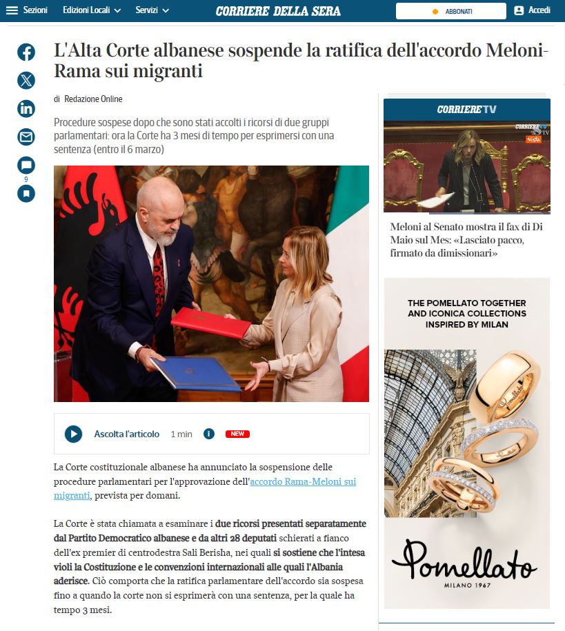 Edhe “Corriere della Sera”, ka pasqyruar në faqen e saj të parë lajmin e se Gjykata Kushtetuese pezulloi ratifikimin e marrëveshjes Meloni-Rama për emigrantët.