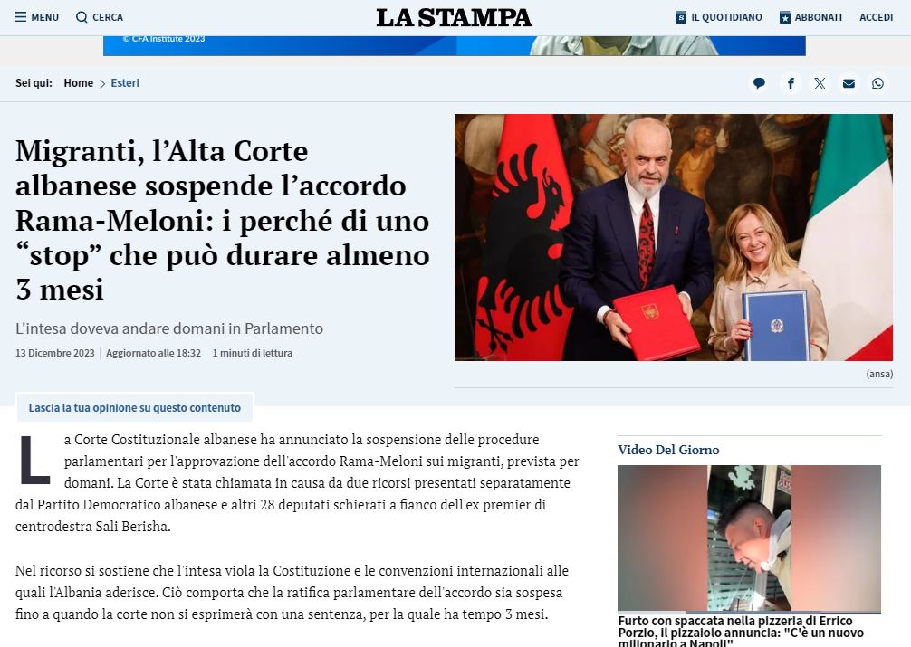 Këtë vendim, La Stampa e quan si një “dush të ftohtë”, për qeverinë Meloni, pikërisht në ditën kur kryeministri mori mbështetjen e plotë nga presidentja e Komisionit Evropian von der Leyen.