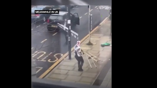 Më pas të dy rrëmbejnë nga një shkallë dhe nisin të goditen mes tyre. Më pas të dy palët u tërhoqën kur një kalimtar rasti u mori shkallët nga duart.