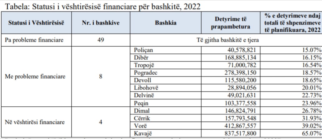 Sipas të dhënave nga tabela e mëposhtme bashkitë Dimal, Cërrik, Vorë dhe Kavajë janë në vështirësi financiare pasi detyrimet e prapambetura tejkalojnë 25 % te shpenzimeve vjetore me 2022, ndërsa 8 bashkitë e tjera, Poliçan, Dibër, Tropojë, Pogradec, Devoll, Libohovë, Delvinë dhe Peqin janë me probleme financiare pasi detyrimet e prapambetura arrijnë në 15-23% të shpenzimeve totale me 2022.