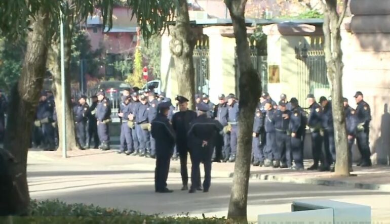 Policë të shumtë kanë rrethuar godinën ku pritet të zhvillohet protesta.