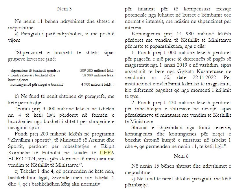 “Fondi prej 200 milionë lekësh në programin “Zhvillimi i sportit” të Ministrisë së Arsimit dhe Sportit, përdoret për mbështetjen e Ekipit Kombëtar të Futbollit në kuadër të UEFA EURO 2024 sipas përcaktimeve të miratuara me vendim të Këshillit të Ministrave”, shkruhet në Fletoren Zyrtare në një akt normativ për ndryshime në buxhetin e vitit 2023.