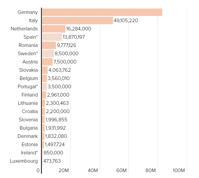 Numri i vaksinave të shpërdoruara priret të korrespondojë me madhësinë e vendeve, me Gjermaninë që llogaritet për 83 milionë doza të hedhura dhe Luksemburgun pak më pak se gjysmë milioni.