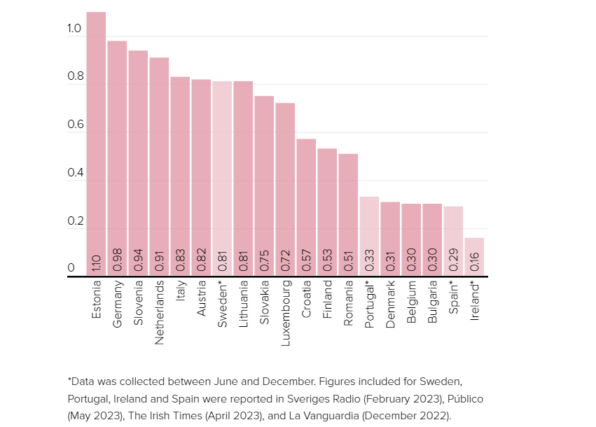 Llogaritjet e POLITICO-s bazohen në numra nga 19 vende evropiane – 15 që dhanë shifra të drejtpërdrejta dhe katër ku vëllimet u raportuan në mediat vendase. Disa shifra datojnë që nga ky muaj; më të vjetrat vijnë nga dhjetori 2022.