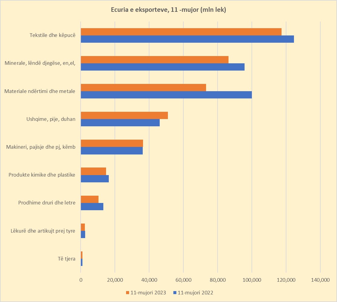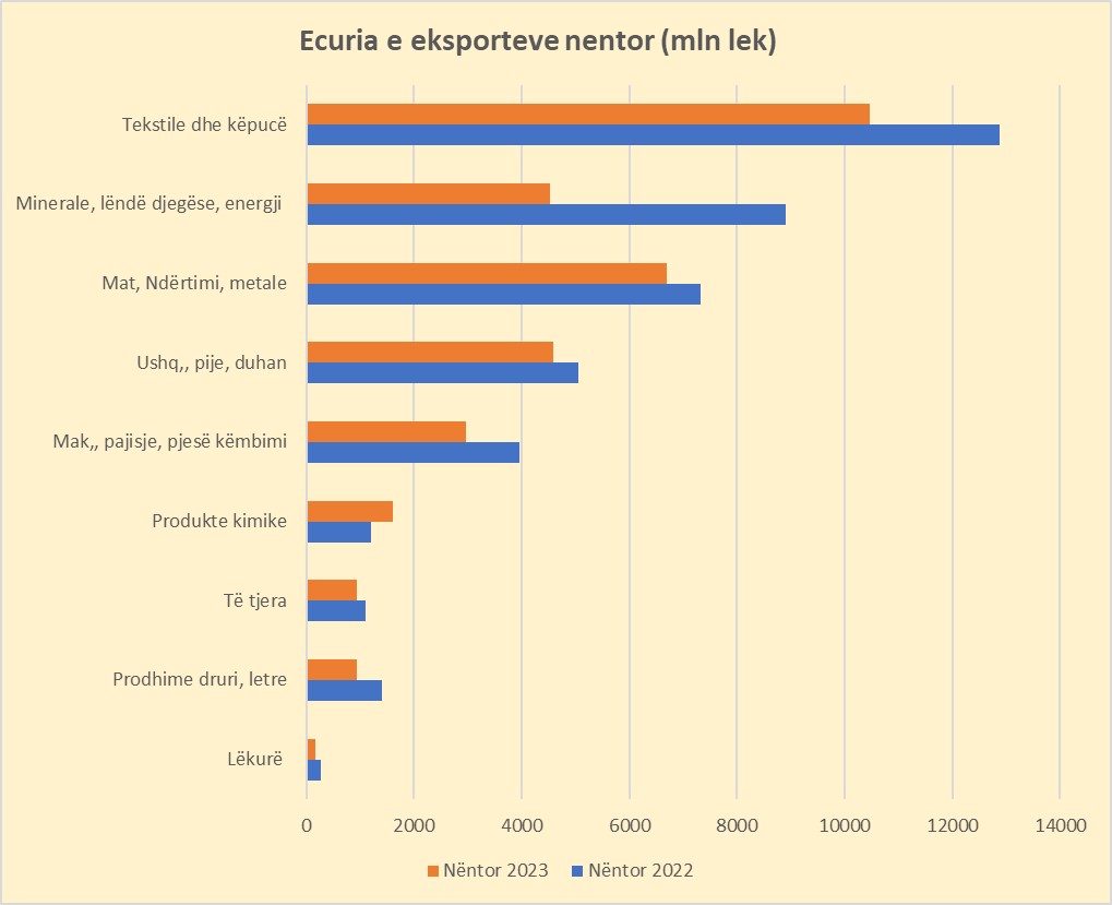 Sipas INSTAT, gjatë muajit nëntor 2023, në uljen e eksporteve prej 21,8% e kanë ndikuar grupet: “Tekstile dhe këpucë” me -18.7 pikë përqindje, “Makineri, paisje dhe pjesë këmbimi” me -25 pikë përqindje, “Prodhime druri dhe letre” me -32.6 pikë përqindje, etj, “Minerale, lëndë djegëse, energji elektrike” me -49.1 pikë përqindje, “Materiale ndërtimi dhe metale” me -8.6 pikë përqindje, teksa “Produkte kimike dhe plastike” ishin me rritje 33.3 pikë përqindje.