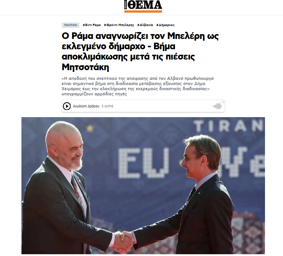 Media greke Protothema e ka quajtur “zhvillim shumë të rëndësishëm për perspektivën e zgjidhjes së çështjes Beleri” qëndrimin e Kryeministrit Edi Rama që kryebashkiaku Jorgo Goro të mos qendrojë më në detyrë pasi humbi zgjedhjet.