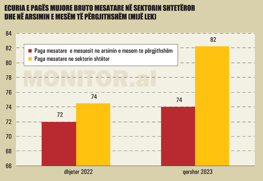 Në tremujorin e dytë të vitit 2023, paga mesatare në sektorin shtetëror arriti në 82,207 lekë, sipas të dhënave zyrtare të INSTAT, ndërsa paga mesatare që një mësues merr në arsimin 9-vjeçar (rreth 71 mijë lekë në muaj) ose sa 86% e pagës mesatare në shkallë vendi (82,207 lekë në muaj).